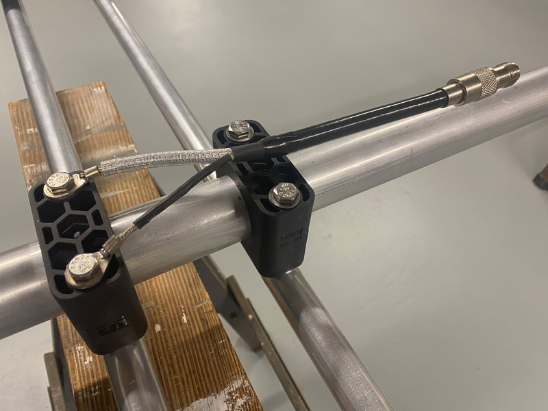 I have decided to add two elements for 6 meters using the open sleeve feed method. I saw this being used on the Momobeam DUO4 6-10 antenna that is available from the ARRL. Dimensions of the added elements and spacing requirements shown below.